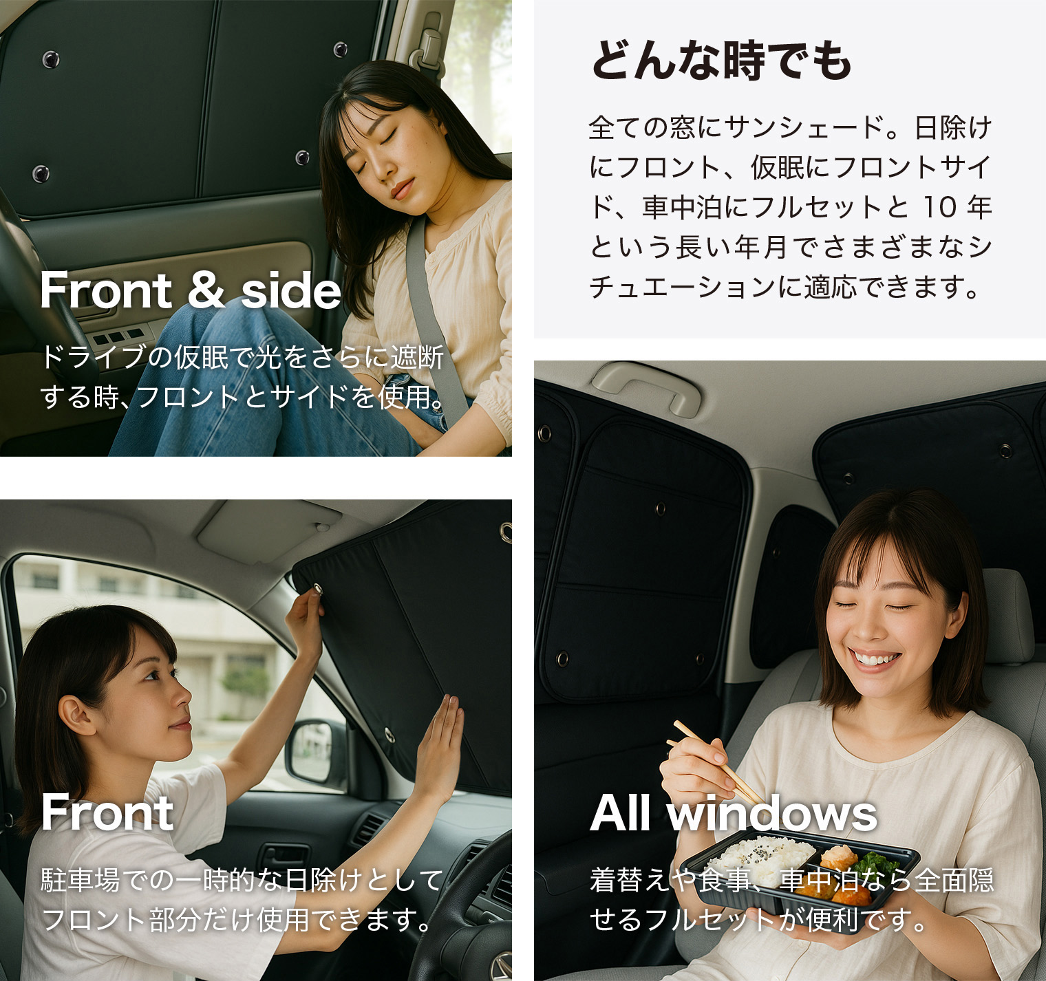 用途に応じて自由にカスタマイズできるフルセットのサンシェード。駐車時、ドライブ中、車中泊時の全てのシーンに対応可能で、10年の使用を目指し、高い汎用性を誇ります。どんなシーンにも柔軟に対応できるため、他のサンシェードでは味わえないロケーションに合わせた多様性と快適さが同時に実感できます。※フルセットで購入されるか、フロントセット、リアセットをそれぞれ購入しフルセットにするかを選択できます。