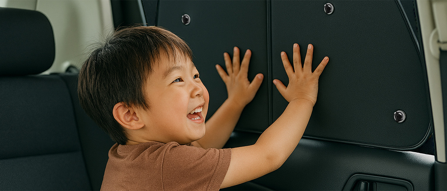 マットな黒生地と目立たない縫製で純正プライバシーガラスのような高級感を演出し、車種の内装形状に合わせて覆いかぶせや隙間への挿入で調整する匠合フィッティングを採用。強い日差しや紫外線を軽減し、フォームの衝撃吸収で人とクルマを守ります。