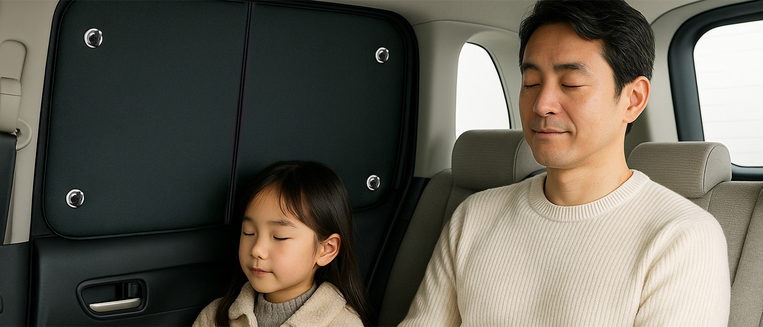 このサンシェードは、ただの日除けではありません。家族との日常や旅の時間に寄り添い、乗り換えまで使い続けられる10年品質を目指しました。車とともに快適な空間であり続けたい。