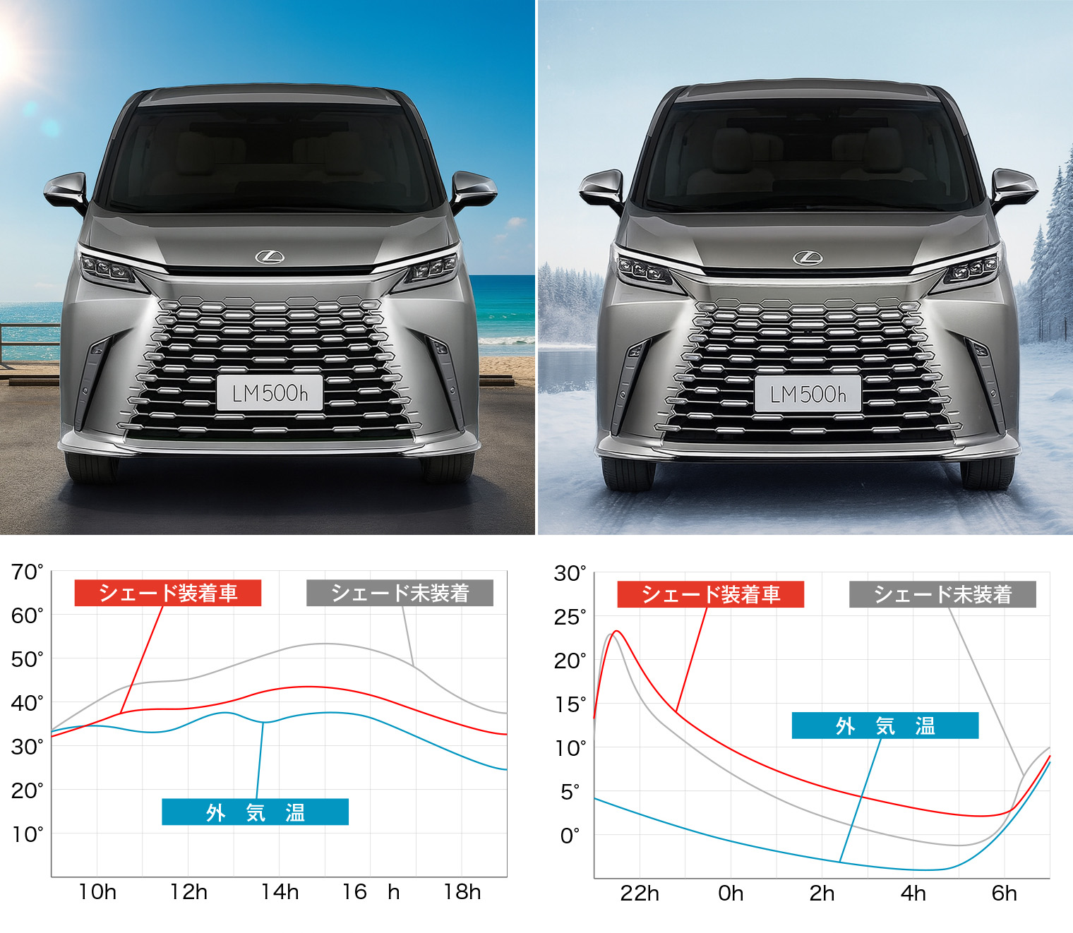 フルセット装着で夏は最大10℃、冬は8℃以上の温度差を実現。二重窓効果で遮熱し、車内の快適性を高めます。